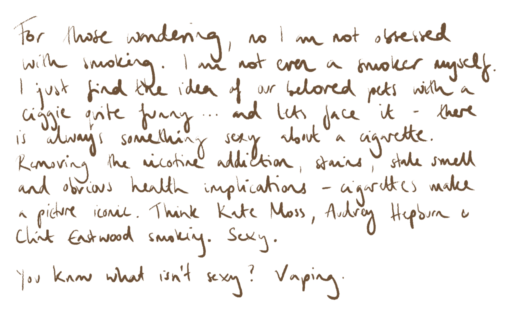 I’ll ask you to send photos of your pet — the more, the better, so I can capture their unique features. We’ll also discuss any specific requests, such as whether your pet should be smoking a rollie, straight, pipe, or nothing at all. You might also like to add a collar or name tag for example.CIGARETTE PACKS: